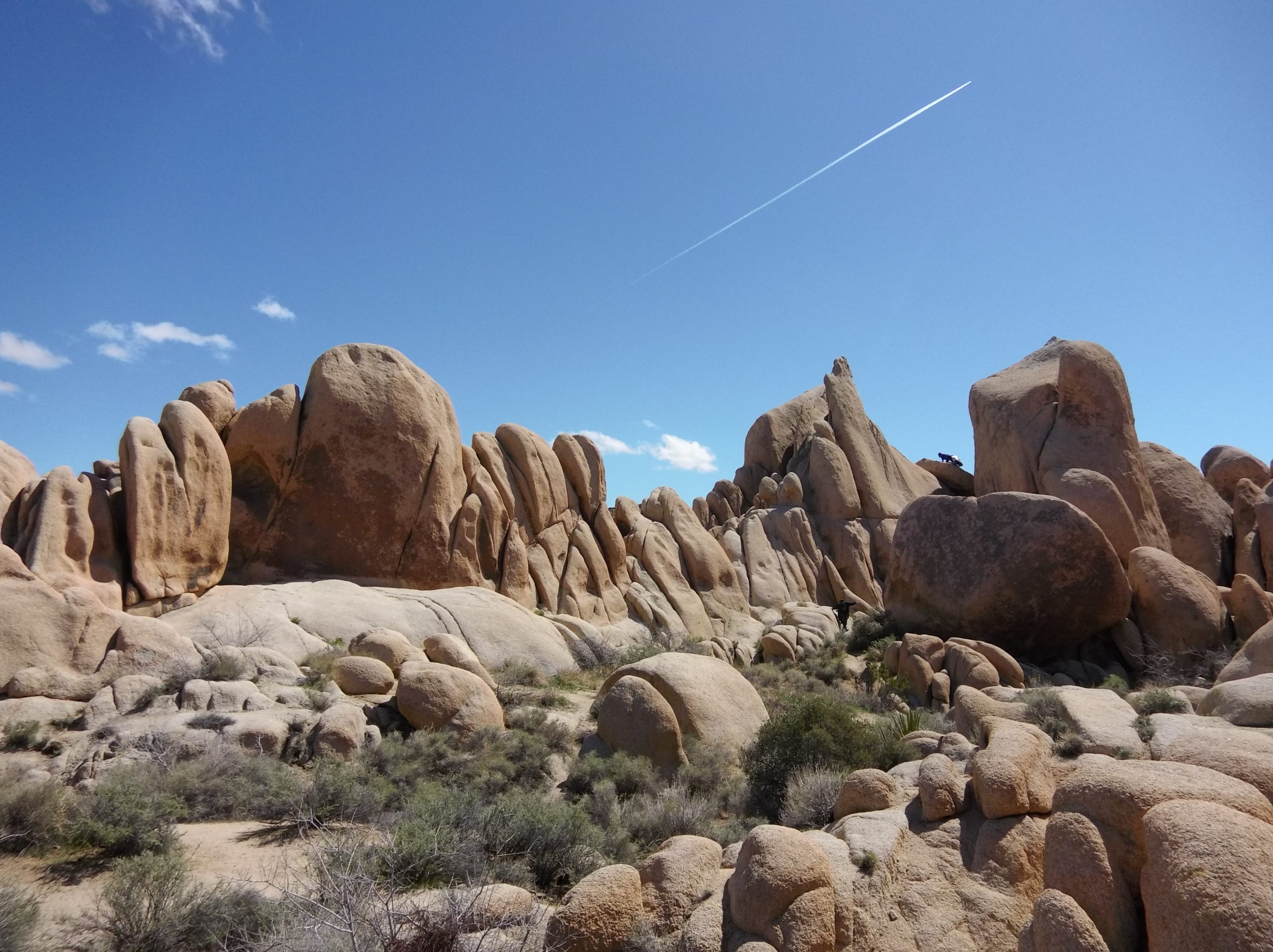 Another place we wanted to visit was Arch Rock Trail, but we don’t see it anywhere on our map. However, after a stop to see the first Joshua trees, we stop at a busy parking lot.