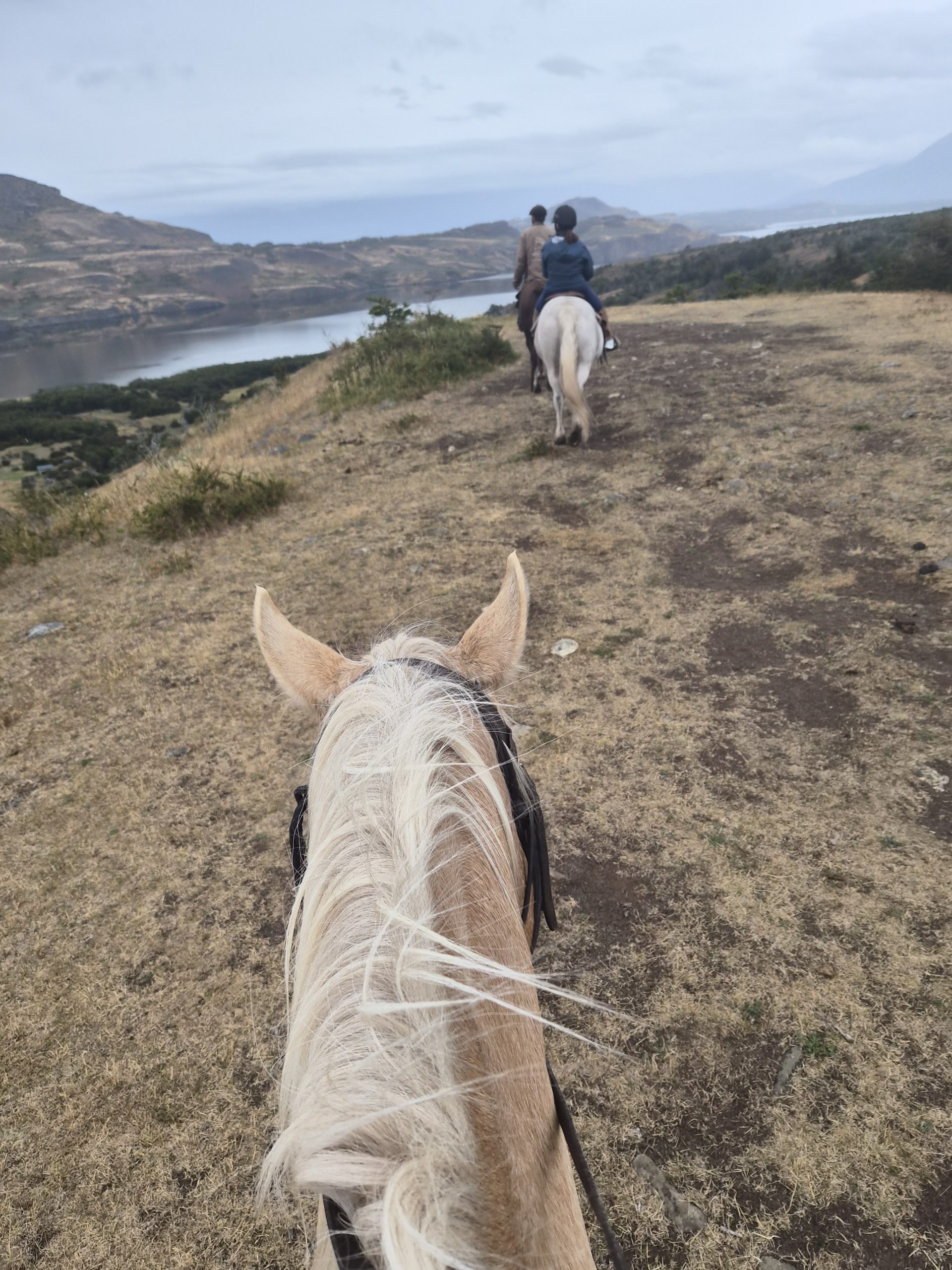 We follow a path toward the lake. The sky is overcast, with a light drizzle in the air, but it only adds to the atmosphere. I lean back slightly in the saddle, letting Sergio and Tricia chat ahead while I quietly take it all in—the beauty of the landscape, the rhythm of the horse, and the peaceful stillness all around us.