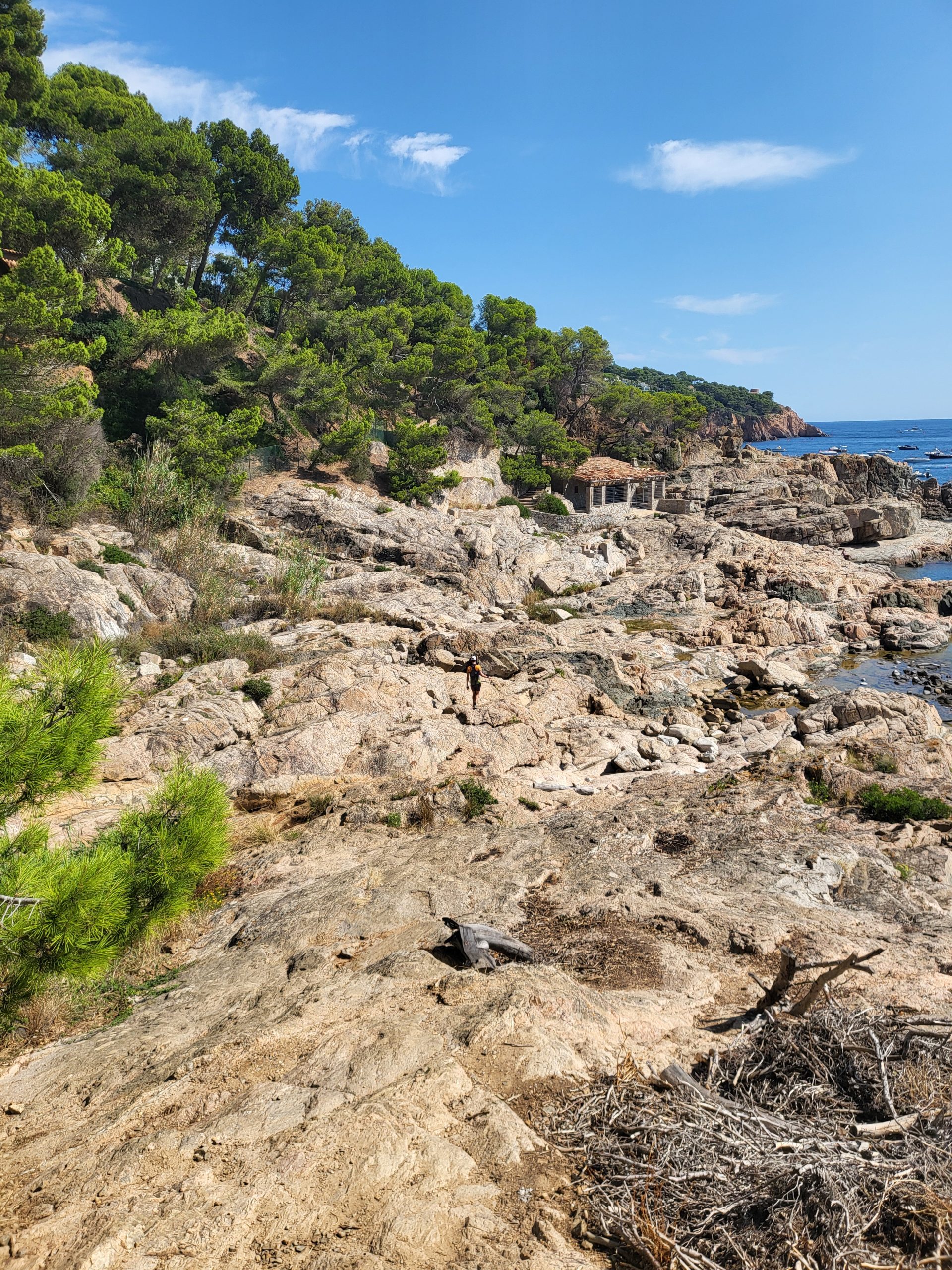 The trail continues and we climb high above the blue waters of Llafranc. We follow fellow hikers towards Sant Sebastia. The markers are now white and yellow. We are still learning to navigate the Cami de Ronda and later learn that white and red markers are for GR- Grand routes- like the Cami de Ronda, the white and yellow for PR – Pequeno or small routes. We take out our poles, as the trail is narrow, with a steep descend and a lot of gravel and rocks, making it difficult to navigate. However, the scenario more than makes up for it. After our little detour, we find the white and red markers again, that lead us to the beautiful little beach of Cala Pedrosa. This beach is only accessible by foot or by boat. There are several boats already anchored of the beach, with people swimming and paddle boarding in the clear waters.